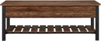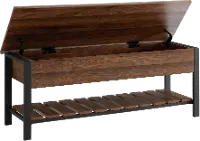 Made of high-grade MDF, premium laminate, and powder-coated metal, the rustic design of this unit emulates a city park bench. Open the top of the bench to access interior storage. Use the bottom slatted shelf as a shoe rack. This wood and metal bench comfortably seats two adults.