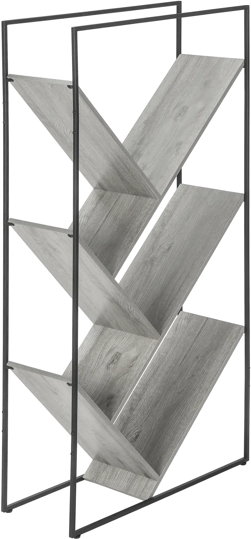 Slanted shelves in a smooth, grey wood-look finish create eye-catching geometric angles that form V-shaped display areas in different sizes. The sleek shelving, supported by a black metal frame, give this 5-tier bookshelf a trendy urban style. Finished on all sides, this striking etagere with open shelves will become the center of attention in any room.