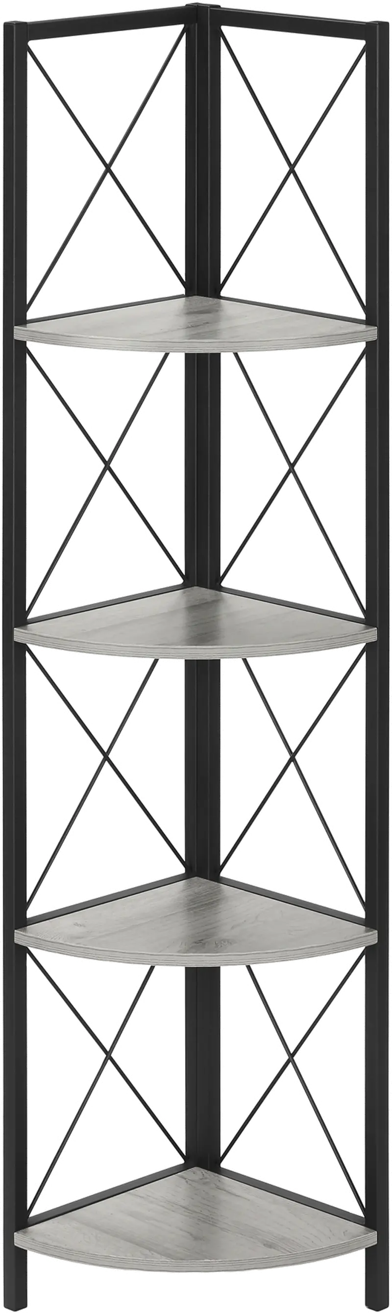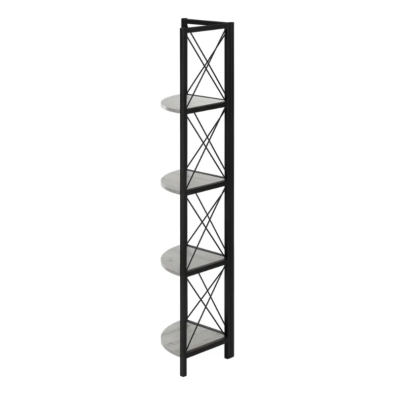 Including 4 solid gray display shelves, this corner display unit features a three-leg black metal frame and a X-Design to add modern flare wherever you choose to place it.