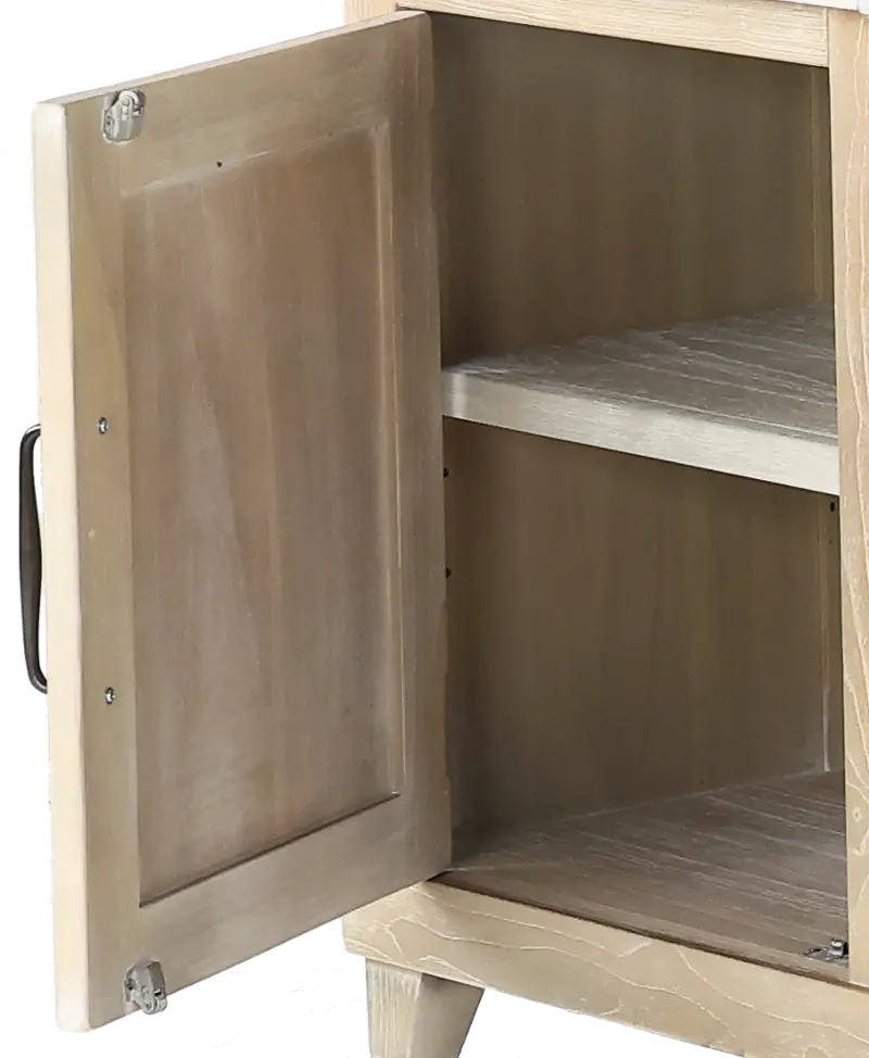 This uniquely shaped bookcase pier is intended to be placed on the left-hand side of the Rivian Fireplace TV stand. The wheat-colored angled frame and light gray top are accented by darker hardware for contrast. Three open shelves offer ample room to display your books, plants, and decor. A roomy bottom cabinet helps keep wires and consols neatly tucked away. Add other pieces from this collection to pull it all together.
