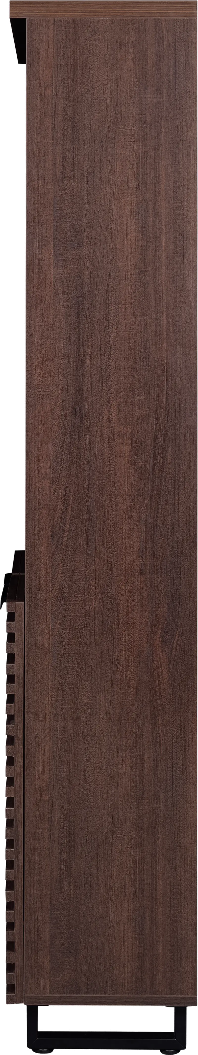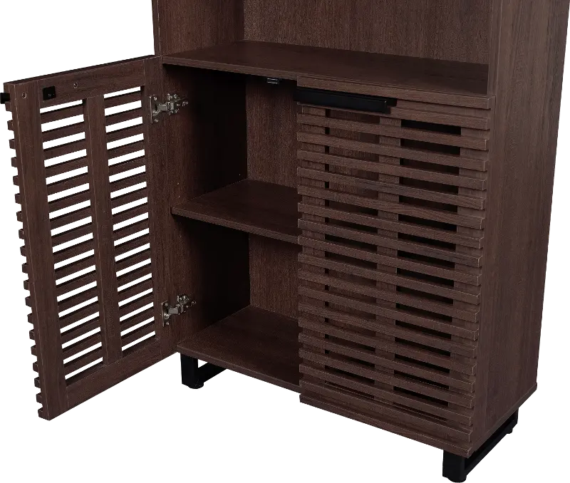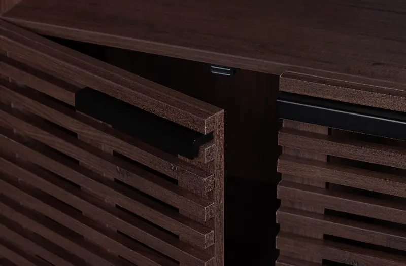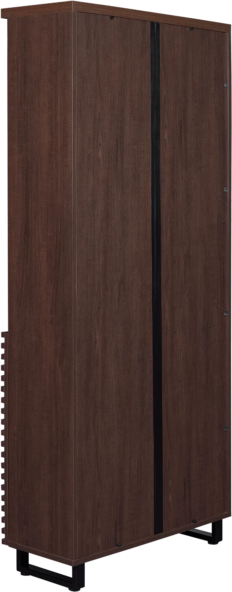 Three spacious adjustable shelves are the perfect place to display your favorite books, family pictures and collectables. The rich brown mahogany finish and etched horizontal lines are complemented by the black hardware on each of the cabinet doors. Unique square-shaped legs support the piece while adding even more visual interest. Add this to your home office today and elevate the look of your space today!