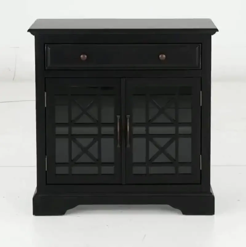 Two glass doors and one drawer provide ample interior storage space. Unique distressing, a beautiful color and the perfect scale makes this cabinet ideal for an entryway, living room or bedroom.