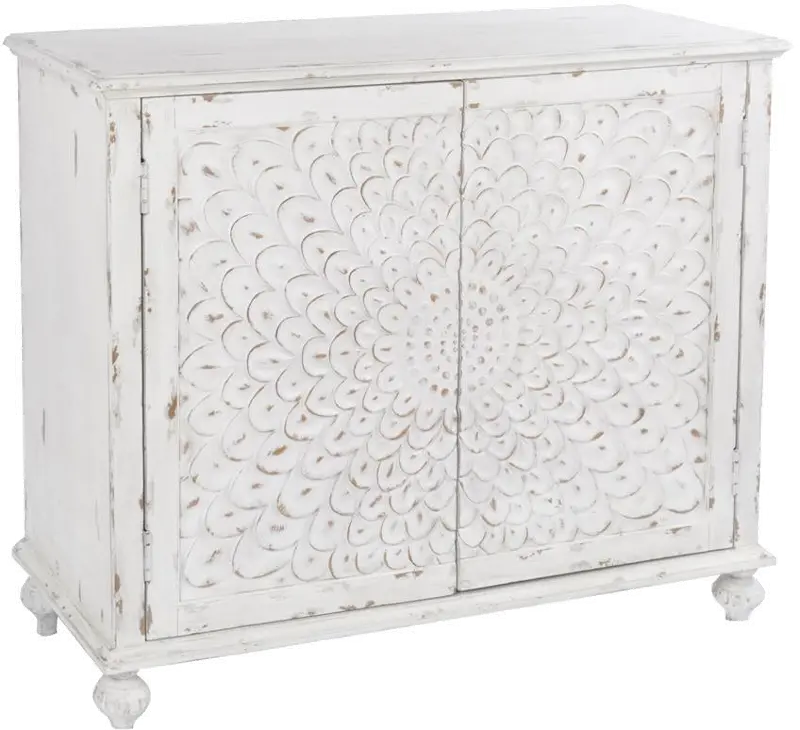 This highly versatile piece features a carved flower pedal mosaic on its 2 doors. A white painted finish with distressed highlights add to its airy, vintage vibe. The doors open to reveal one adjustable shelf for convenient, yet concealed storage.