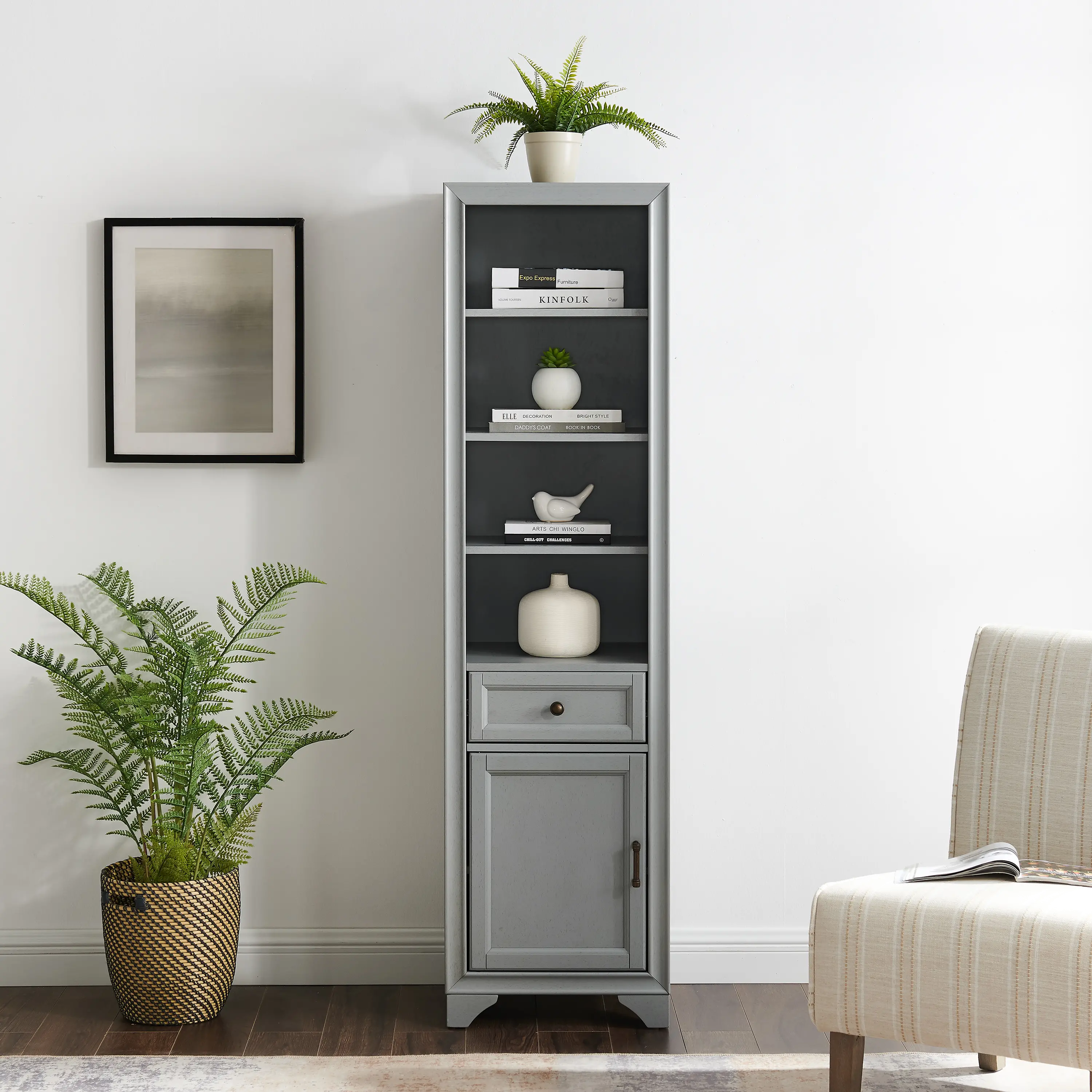 The Tara gray cabinet from RC Willey offers much-needed organization to narrow bathrooms, hallways, kitchens, and beyond.
