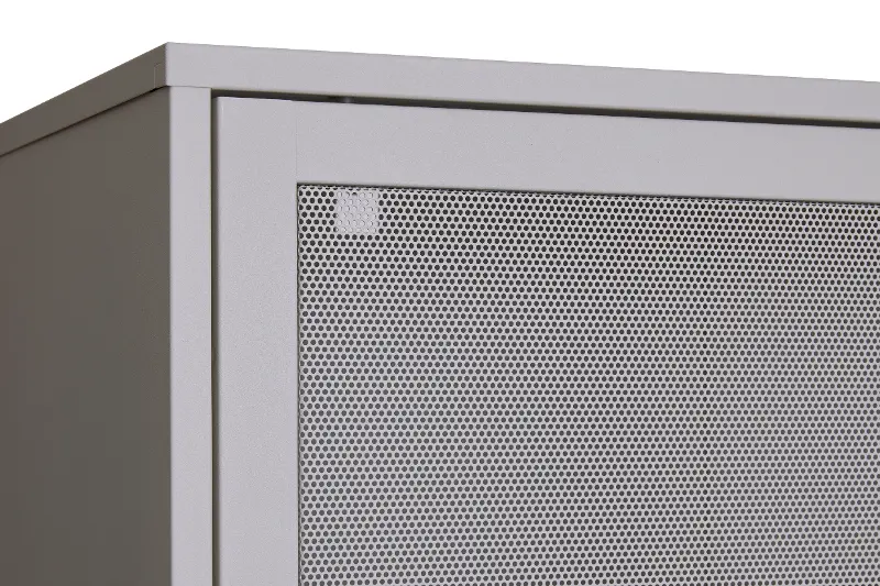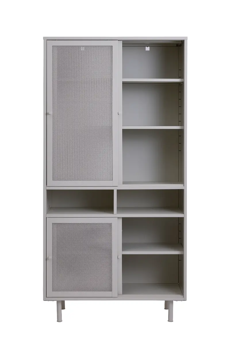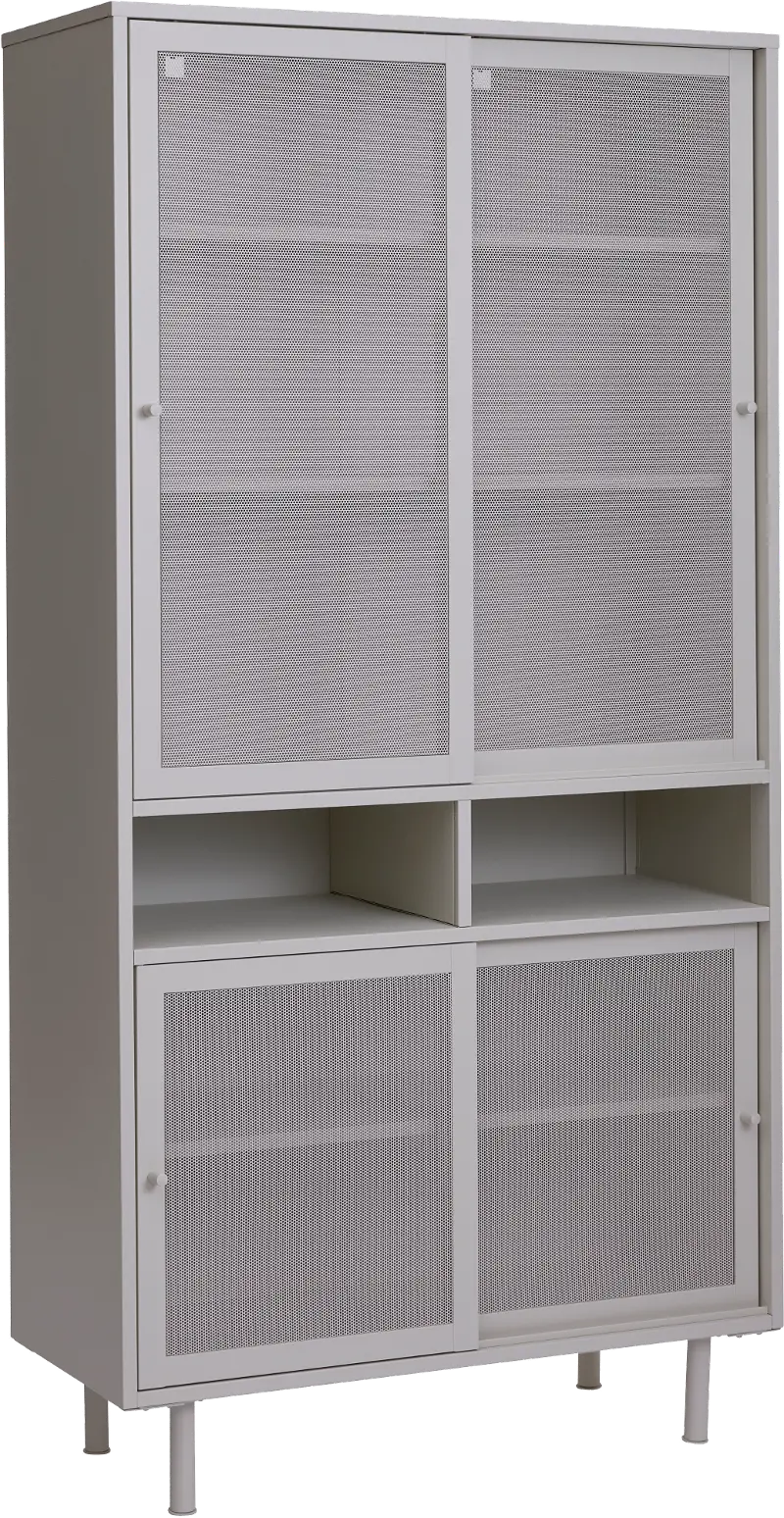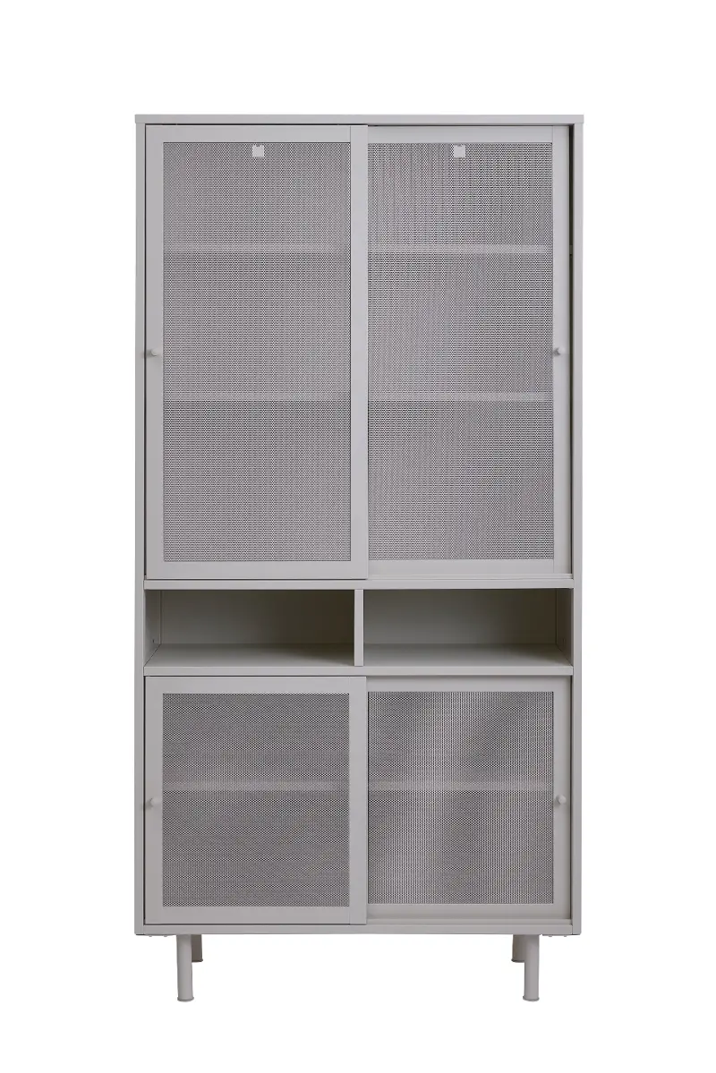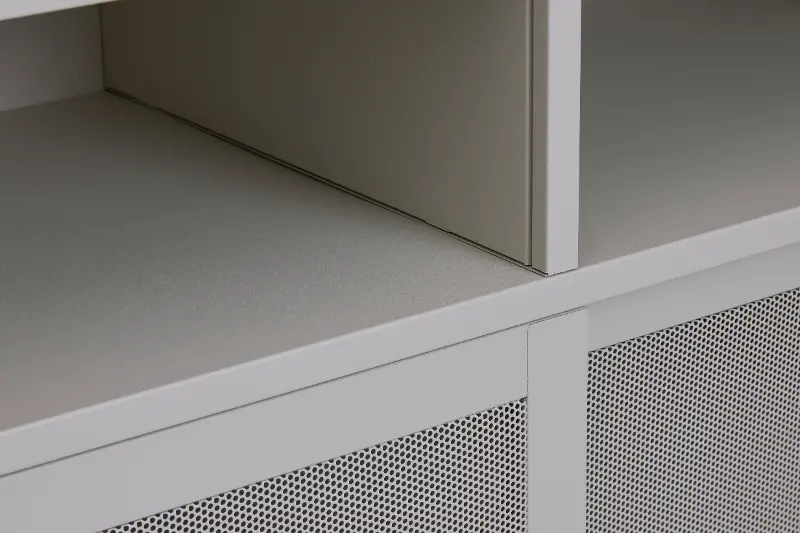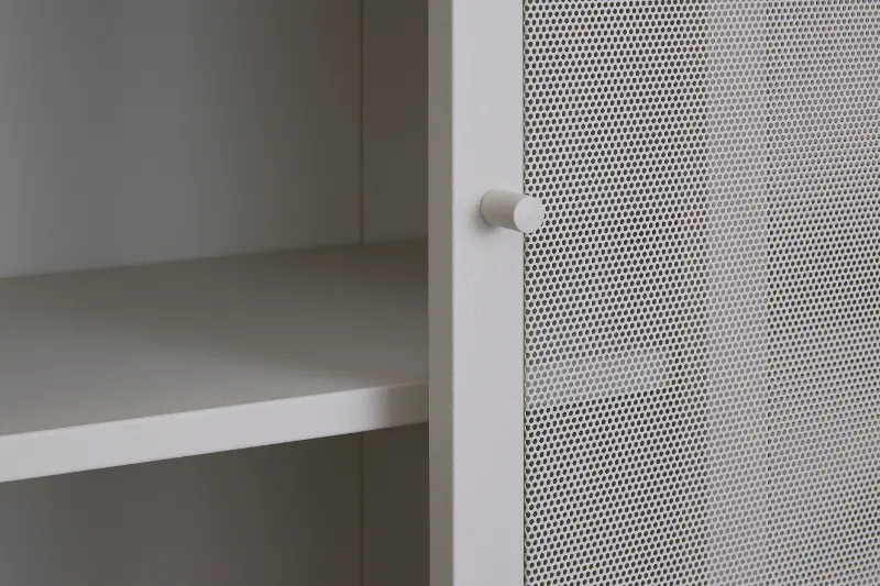 The design is distinguished by mesh-paneled fronts and open storage, providing polished details to the design. The collection, made up of a sideboard, two cabinets of varying heights, and a TV lowboard, effortlessly enhance any space with its versatility.