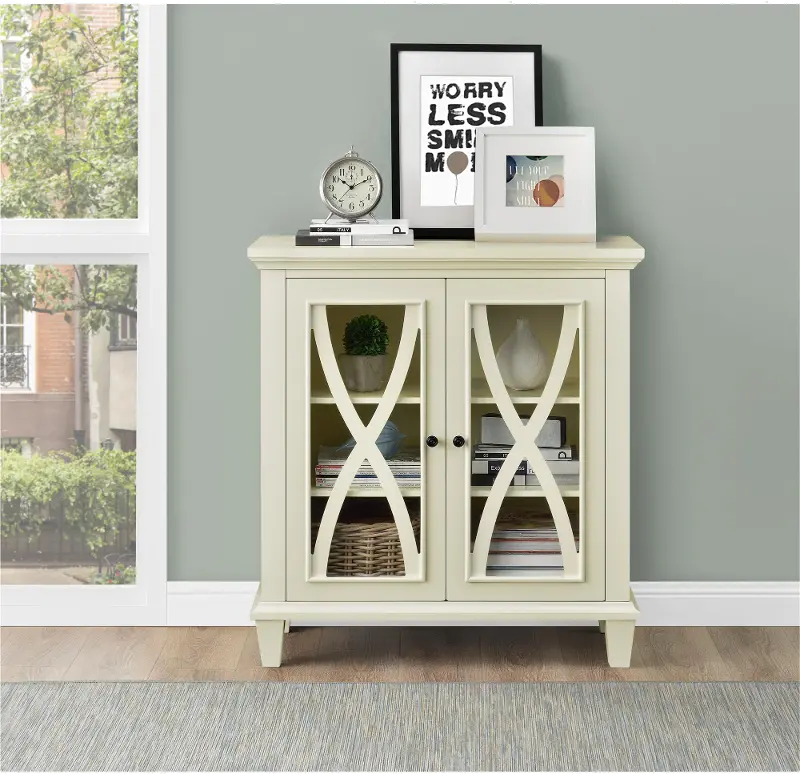 The cabinet’s rich ivory finish, curved X-designs over the glass doors and decorative moldings create a regal look that’ll give any space a sense of luxury and timelessness.