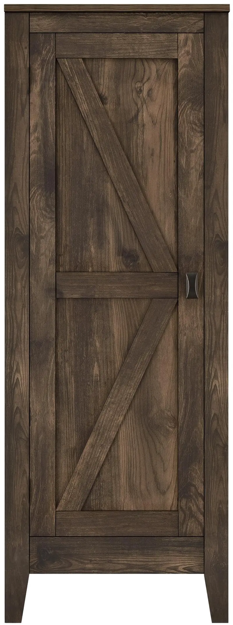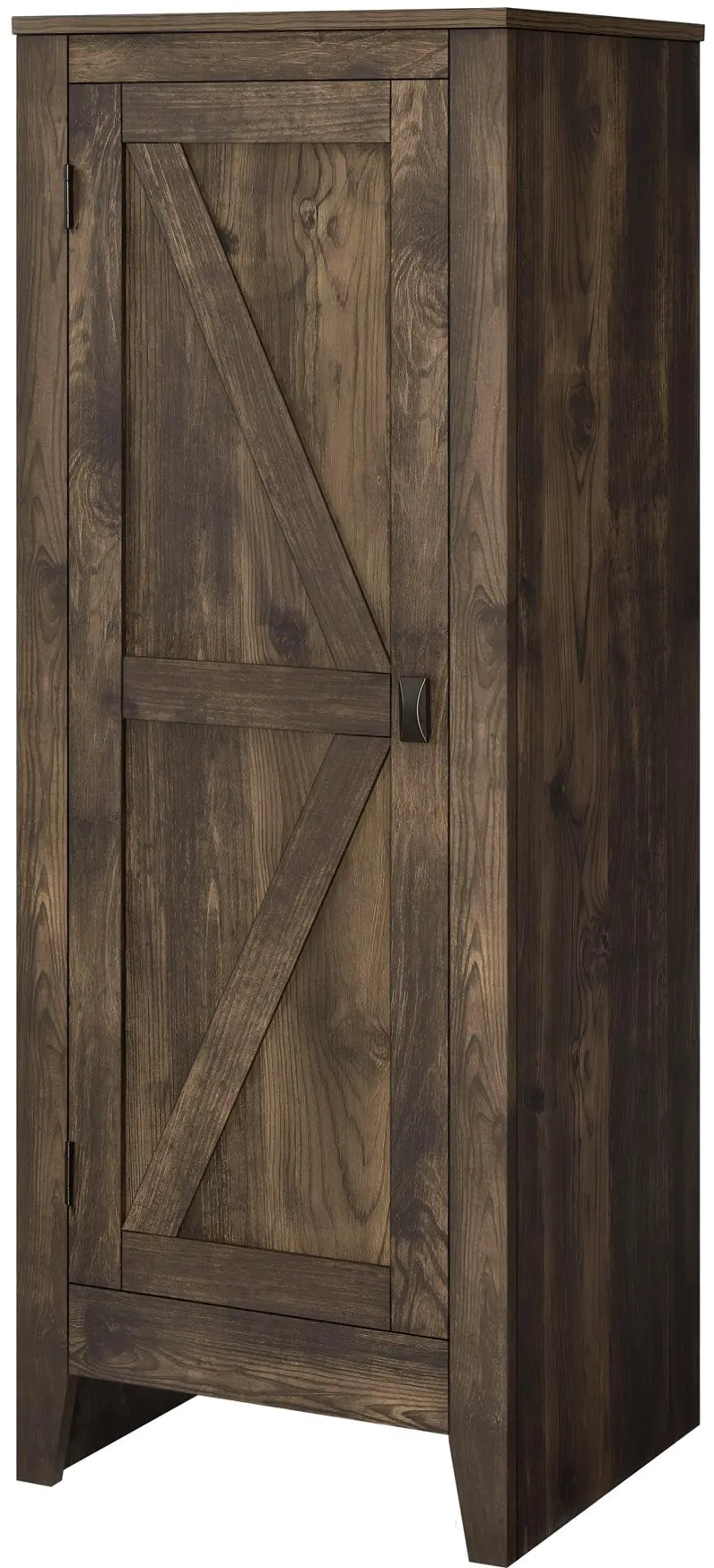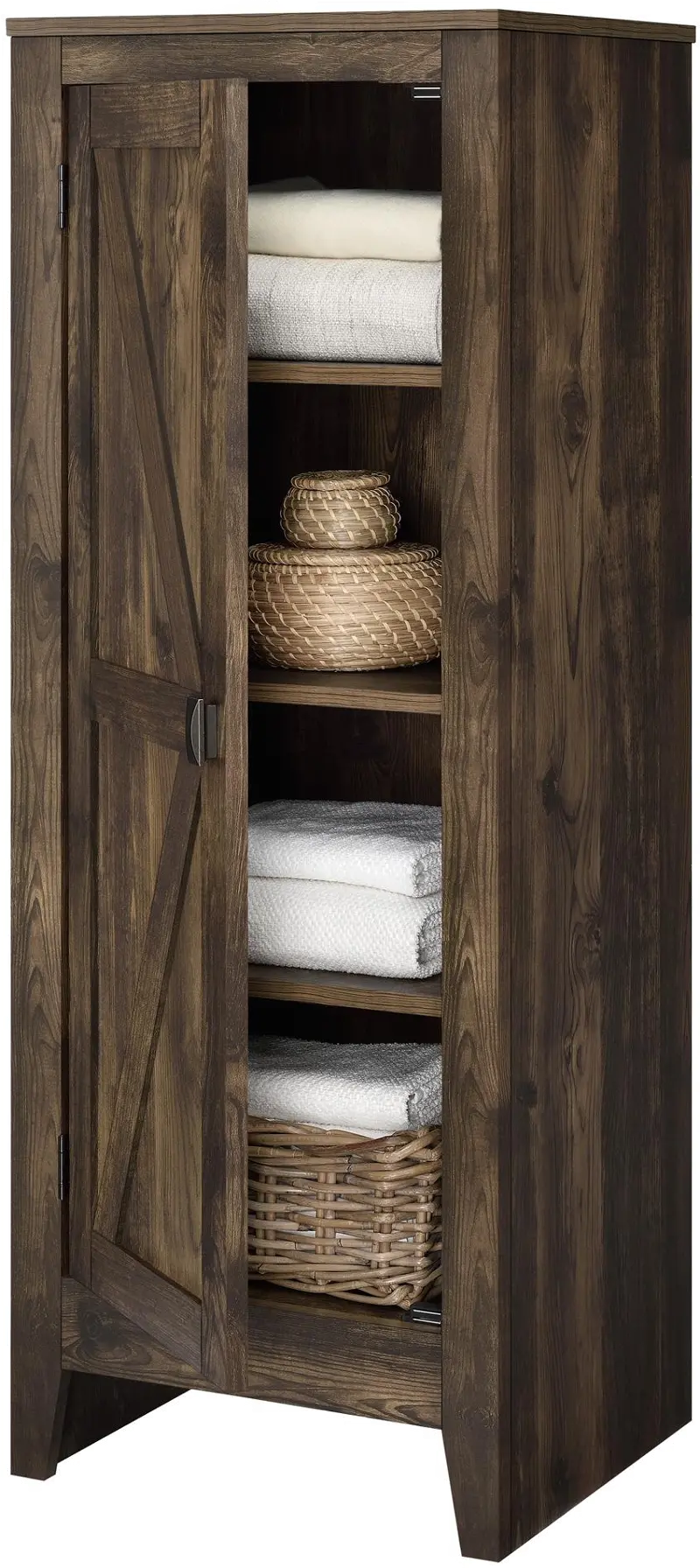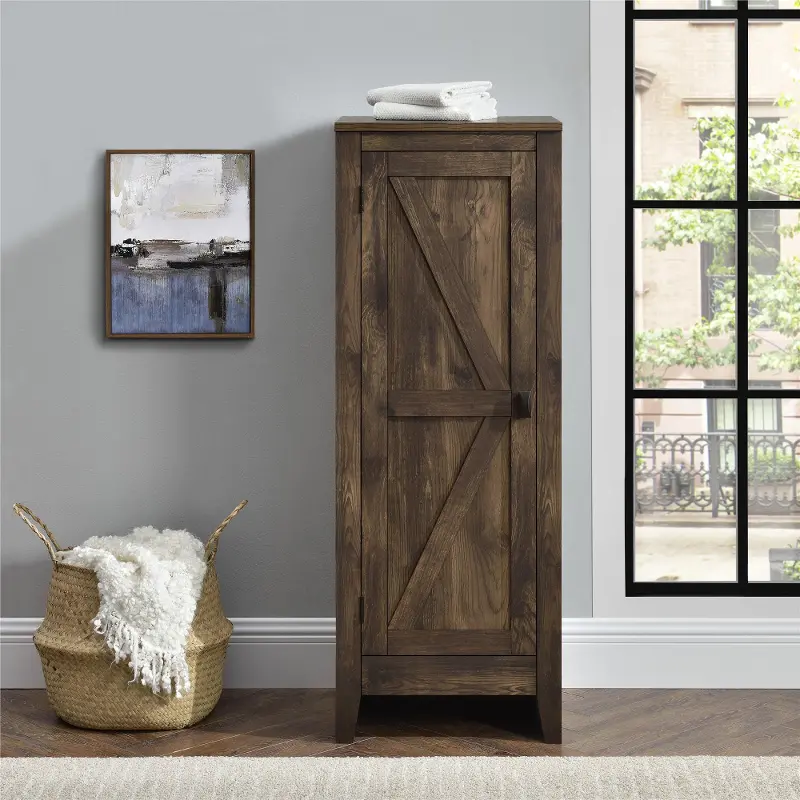 The rustic barn style design with rustic brown woodgrain finish gives the look of an old weathered cabinet but the sturdy laminated particleboard and MDF make this Cabinet the perfect piece for all of your storage needs.