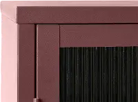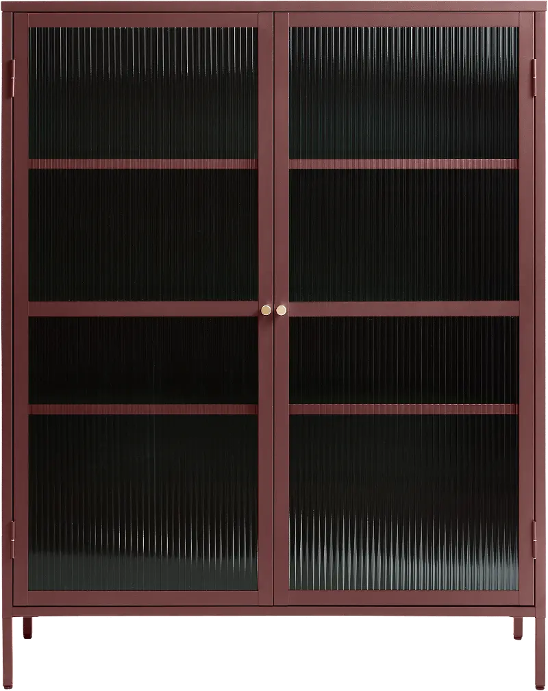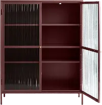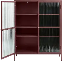 This metal two-door cabinet is designed with two glass panel door fronts, four shelves, and simple metal framework, making it the perfect home for your favorite pottery, books, and other collected curiosities.