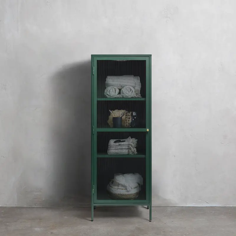 This metal one-door cabinet is designed with one glass panel door front, four shelves, and simple metal framework, making it the perfect home for your favorite pottery, books, and other collected curiosities.