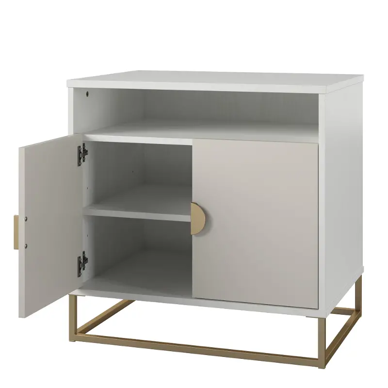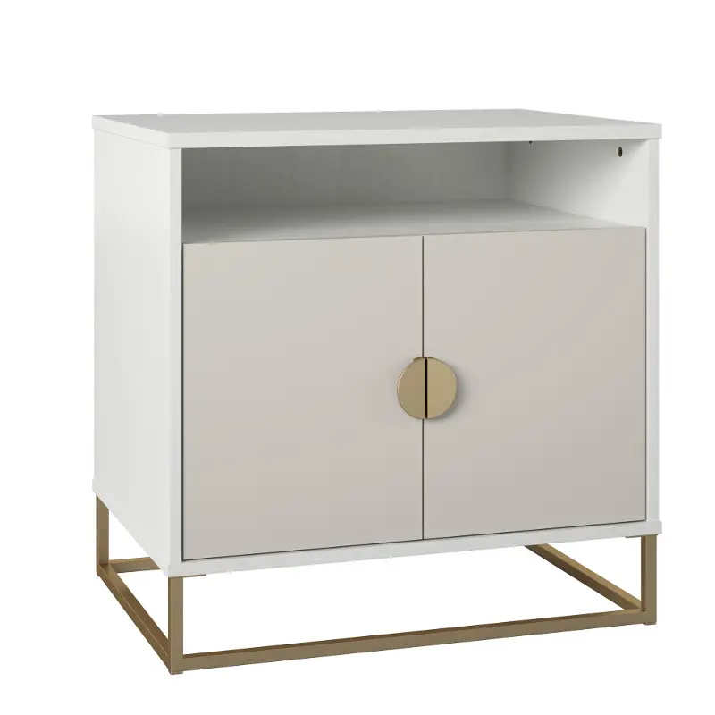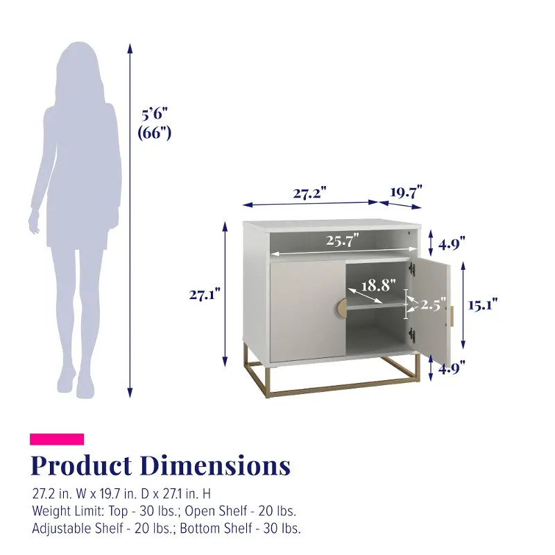 The PH X Kelly Collection is a modern minimalist’s dream come true with classic neutral tones and brassy gold accents inspired by Paris’ life, tastes, and love for good design. Constructed from ultra-durable MDF, engineered wood, and powder-coated metal, this chic Accent Table that doubles as a Nightstand offers a fresh contemporary feel, at an accessible price point. Half-moon door pulls, and an open geometric frame adds the perfect pinch of whimsy to this glamorous collection, creating not only an elegant bedroom ensemble but a work of art that is both classic and fun. Skimping on storage is never okay, which is why this functional Accent Table features both open and closed shelving for all your nocturnal necessities. Behind the cabinet doors, you’ll find classic European hinges and two additional shelves, one fixed and one adjustable, for customizable storage options.