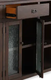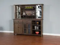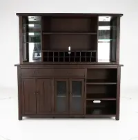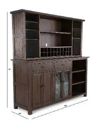 Finished in a rich dark tobacco leaf, the hutch features adjustable glass shelves with wine storage and display space. The buffet provides both open and closed storage. The shelves can be removed and would fit a small refrigerator.
