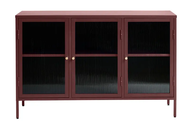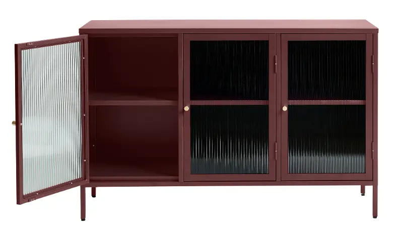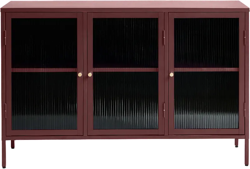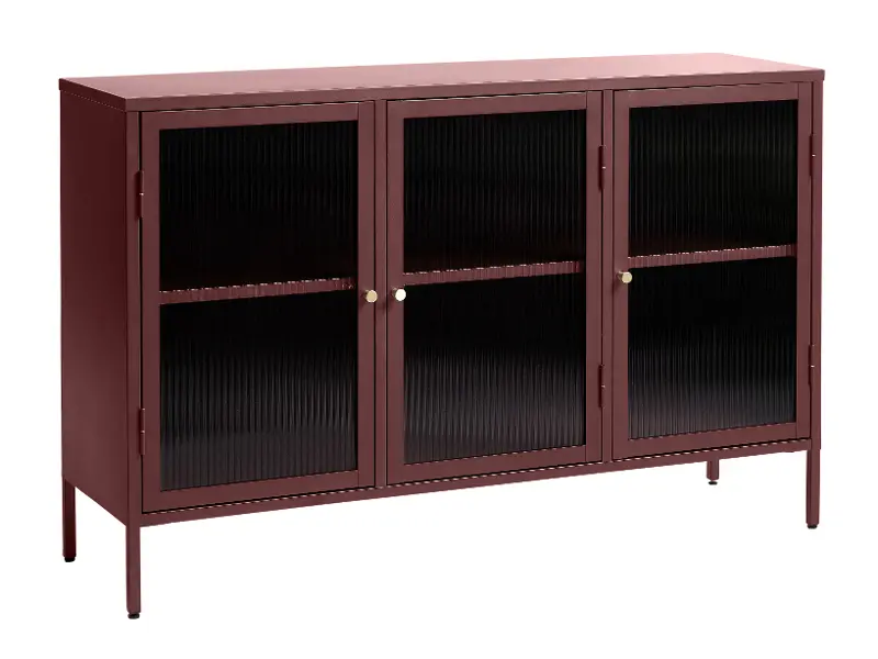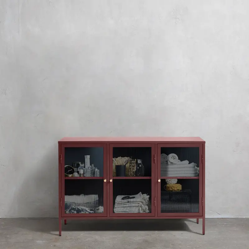 This metal three-door cabinet is designed with three glass panel door fronts, two shelves, and simple metal framework, making it the perfect home for your favorite pottery, books, and other collected curiosities.