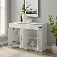 Featuring two large cabinets with adjustable shelves and two full-extension drawers, this sideboard is great for home organization. Useful as a classic dining room sideboard or as a TV stand, the Stanton sideboard’s modular design pairs with other items in the collection for customizable storage.