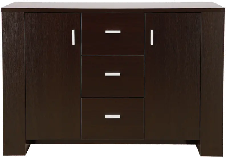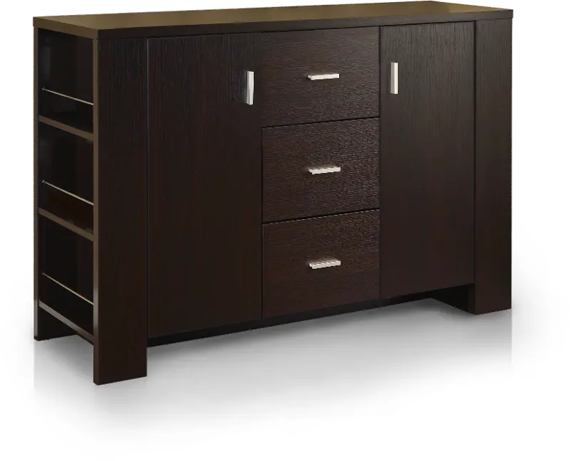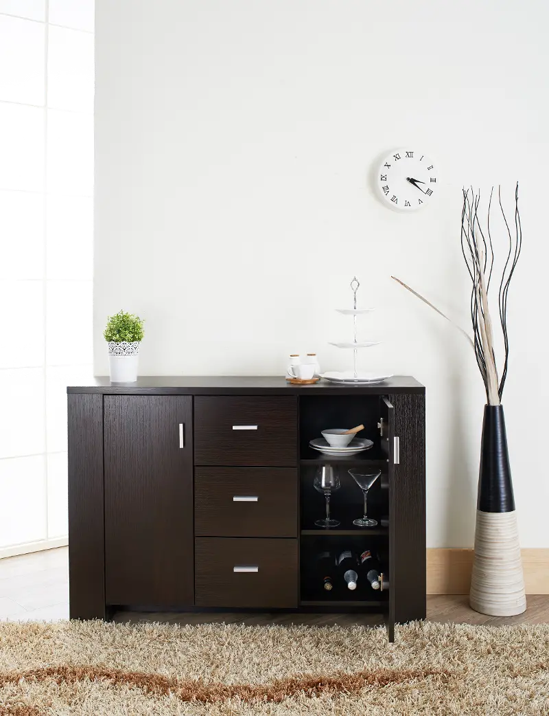 Its sleek cappuccino finish and slim profile will fit comfortably in any size room. Its spacious 2 cupboards with 3 shelves provide ample storage for all your dinnerware. Use the 3 drawers with chrome-brushed handles to hold your silverware, placemats, and more. Each side features 3 narrow shelves with small safety rails so glasses, napkins, or your favorite mugs stay securely in place.