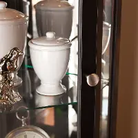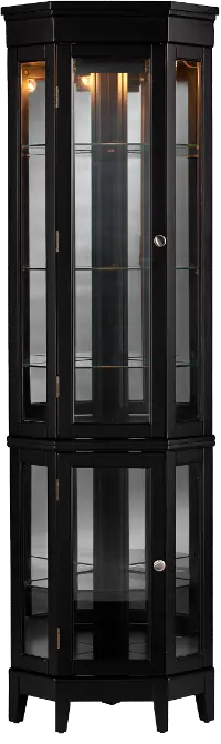 The painted black finish with brushed nickel door knobs complements the sleek design with stylish legs and tempered glass panels. A mirrored back and four adjustable glass shelves enhance the lighting on your delicate possessions and give more visual depth. This lighted curio is sure to become a cherished piece of furniture in your home.