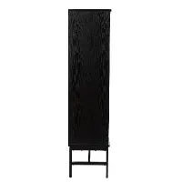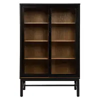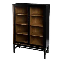 Black and natural finishes craft a clean, modern look while sliding glass doors reveal adjustable shelves, offering customizable storage. Place in your open-concept living space to show off your book collection, or slide into your game room to stow extra blankets and board games. From your office to your dining or living room, this multi-purpose cabinet will add stylish storage and display space to your home.