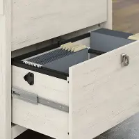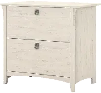 The Bush Furniture Salinas file cabinet creates a casual feel in your home office with decorative wood details, curved base rails and elegant metal drop pull hardware. A pair of file drawers open on smooth full-extension ball-bearing slides so you'll have no trouble reaching papers in the back. The cabinet holds all your letter and legal-size files so you'll always feel organized. Finished in an on-trend, neutral antique white with a slightly distressed touch, the country charm of this cabinet looks great wherever you call home. Complete your space with coordinating items from the Salinas collection.
