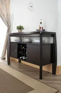 There is open storage underneath the top to display your favorite dishes and concealed storage behind the drawers to hide the items that look untidy. The dark espresso finish complements the design and will look beautiful in your home.