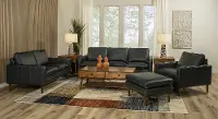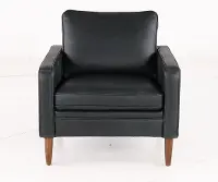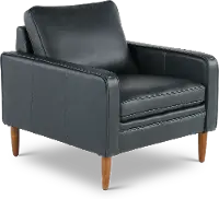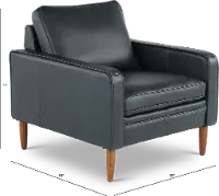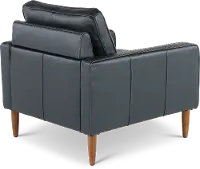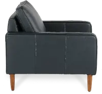Drawing on mid-century inspiration, this chair is covered in an inviting and handsome blue leather that can easily be personalized by adding a favorite toss pillow or throw. Its clean silhouette, thin track arms, and lofty legs give it a modern feel.