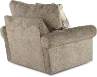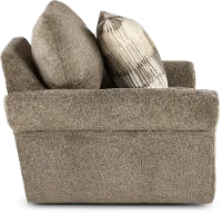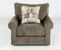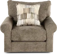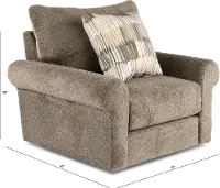 Built for comfort and durability, this chair's versatile silhouette features a convenient swiveling function, simple roll arms, and soft yet supportive cushions that invite relaxation. Its light brown upholstery and neutral-hued toss pillow enhance the piece's welcoming, down-to-earth vibe.