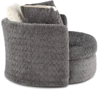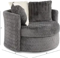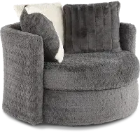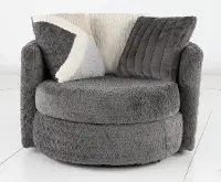 The curvy and inviting swivel chair is covered in a plush iron gray fabric with horizontal channeling. Supportive cushions with a sink-right-in feel make unwinding hard to resist.
