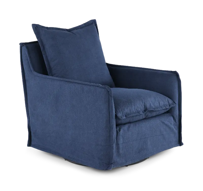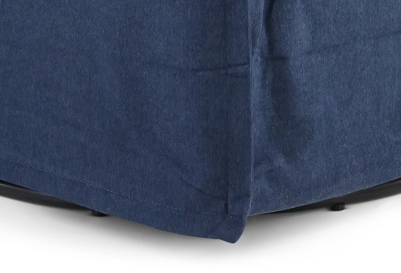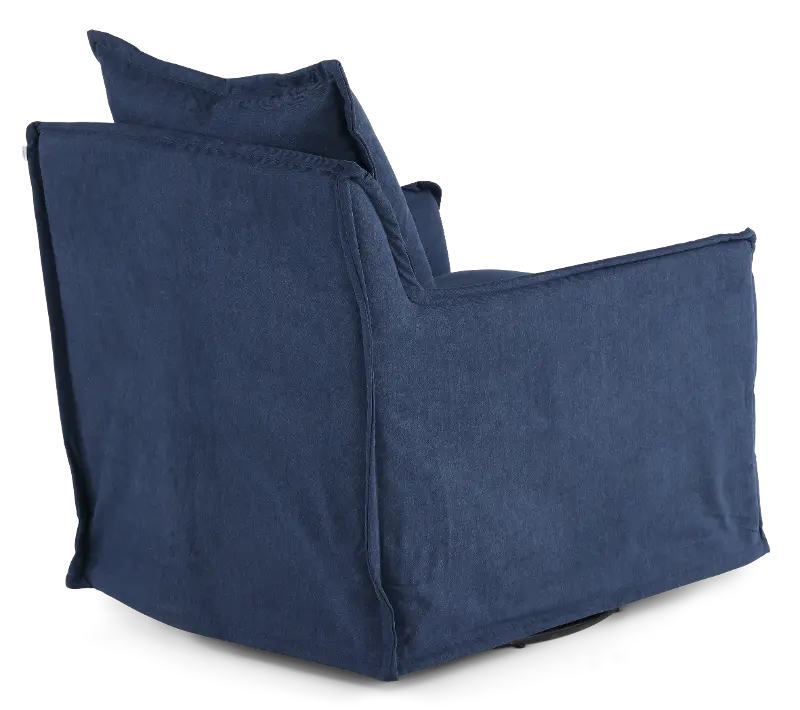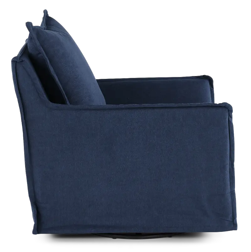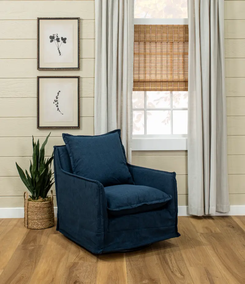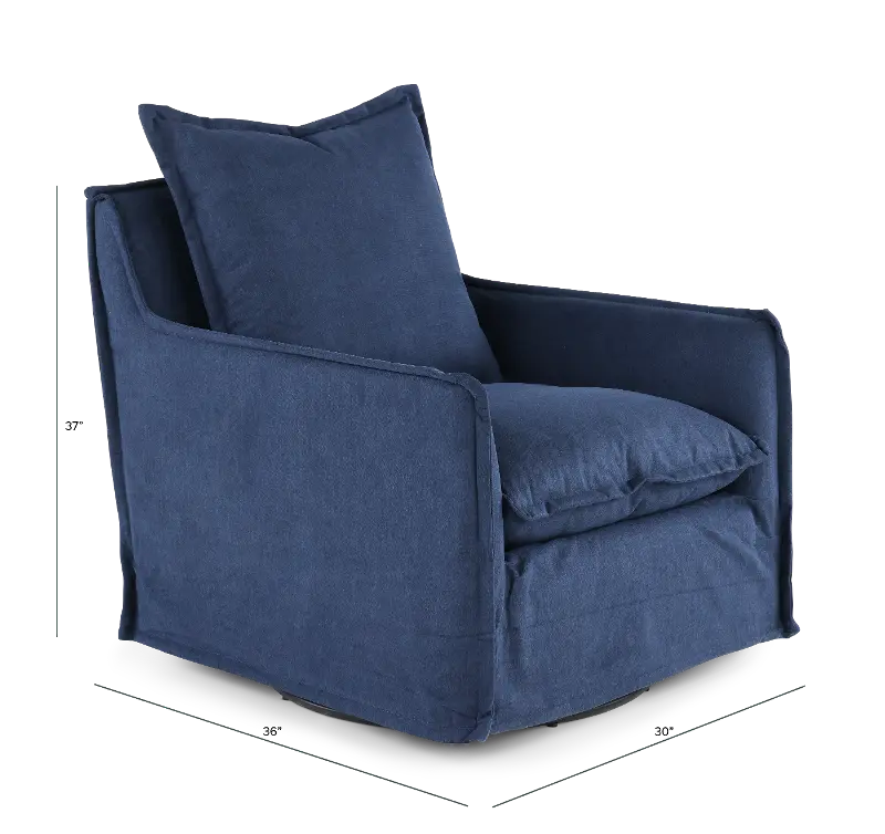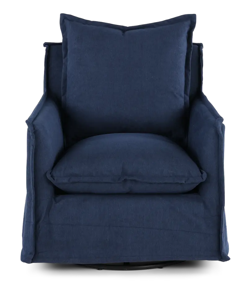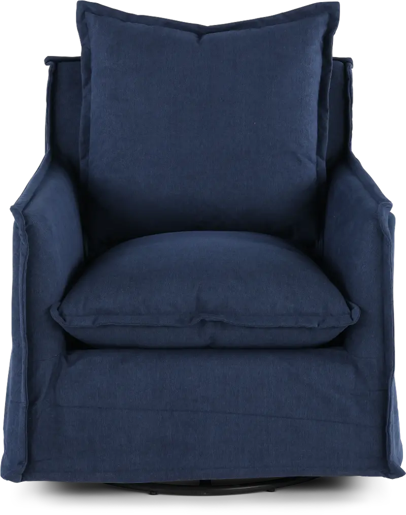 Completely covered with plush navy upholstery, it hides the metal swivel and glider mechanism, keeping the chair's appearance soft and inviting. A back and seat cushion are perfectly padded to allow for easy relaxation. Sink into ultimate comfort with this stunning chair, which will add just the right amount of color and sophistication to your home.