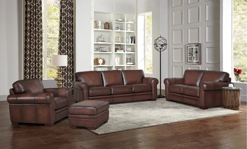 The Eglington caramel brown leather 4-piece living room set exudes classic charm and handsome, enduring style.