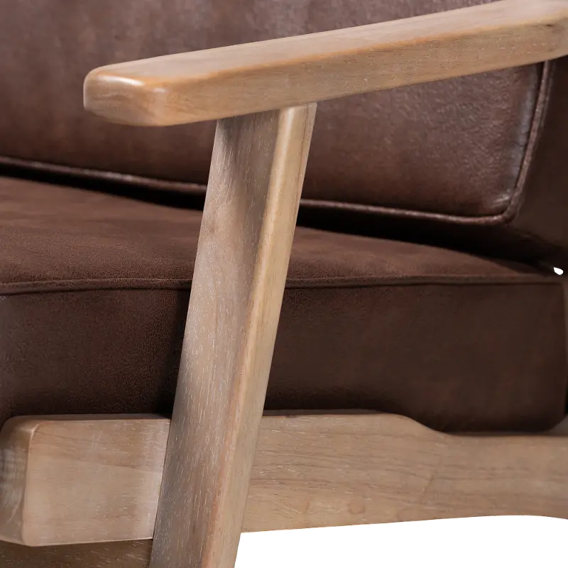 Inspired by mid-century modern design, each piece features a low profile and angular frame. Dark brown faux leather effect fabric upholstery gives the pieces a sleek look that complements the antique oak finish on the solid rubberwood frames. Its thick, foam-padded cushions provide comfort for years to come. Striking from any angle, the Petra set is well suited for both private residences and public office spaces.