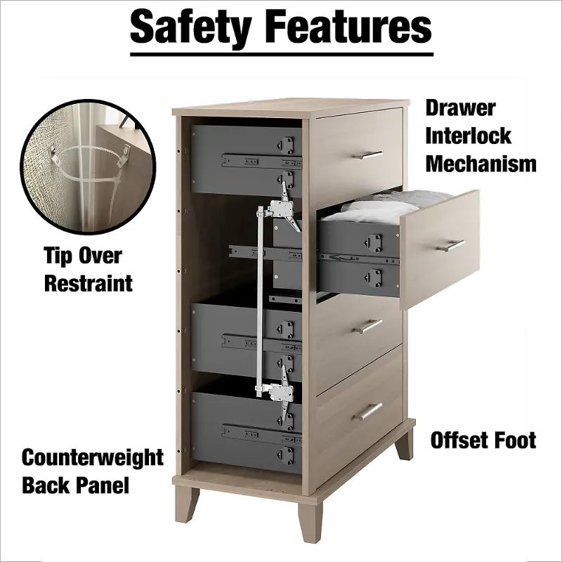 - Additional safety features include offset front feet and counterweight back panel for added stability