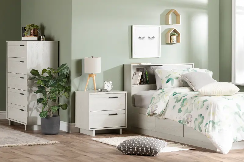 Add modern industrial flair to any bedroom space needing additional storage with the light gray winter oak Fynn chest of drawers and RC Willey has it!