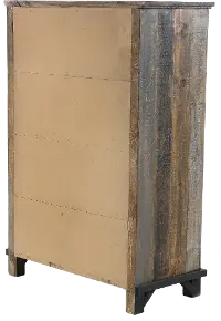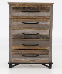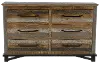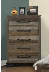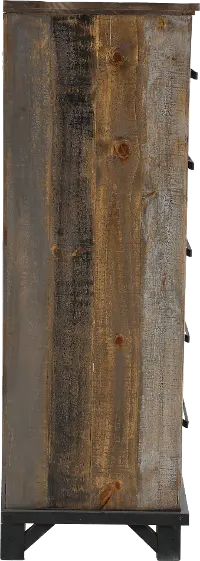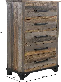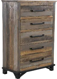 Sturdily crafted from pine, its gray and brown multi-step rubbed stain with a clear lacquer finish allows you to see the natural markings and color variations of the wood, giving it a reclaimed look. Its 5 spacious drawers are enhanced with hand-forged iron pulls that lend an industrial touch.