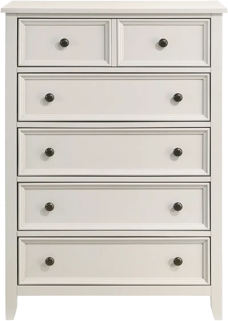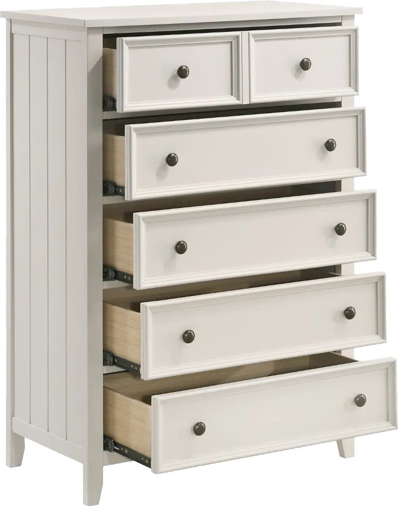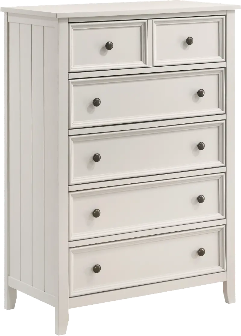 This chest of drawers is solidly crafted and finished in a versatile and airy off-white, while framed shiplap-inspired panels and knob hardware lends a farmhouse vibe. Its 5 drawers open and close smoothly with ball-bearing glides, providing generous storage.