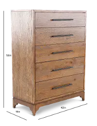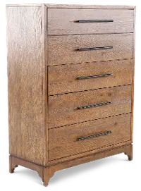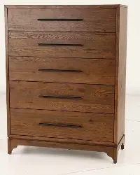 Handsomely crafted, this chest of drawers features a rich whiskey oak finish that showcases the unique grain patterns of the wood, while black drawer pulls provide a sleek contemporary contrast. The five drawers glide open and closed effortlessly on ball-bearing extension slides, offering generous storage space for clothing, linens, or other essentials.