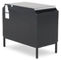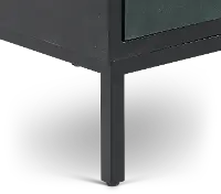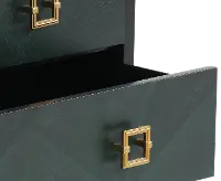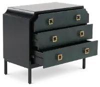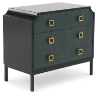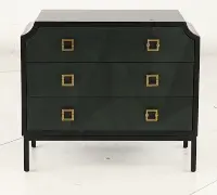 A black frame is enhanced by three blue drawers. Each of their knobs is accented by a gold square, adding more to the striking beauty of this accessory. Slim, black metal legs keep this drawer looking sleek and modern.