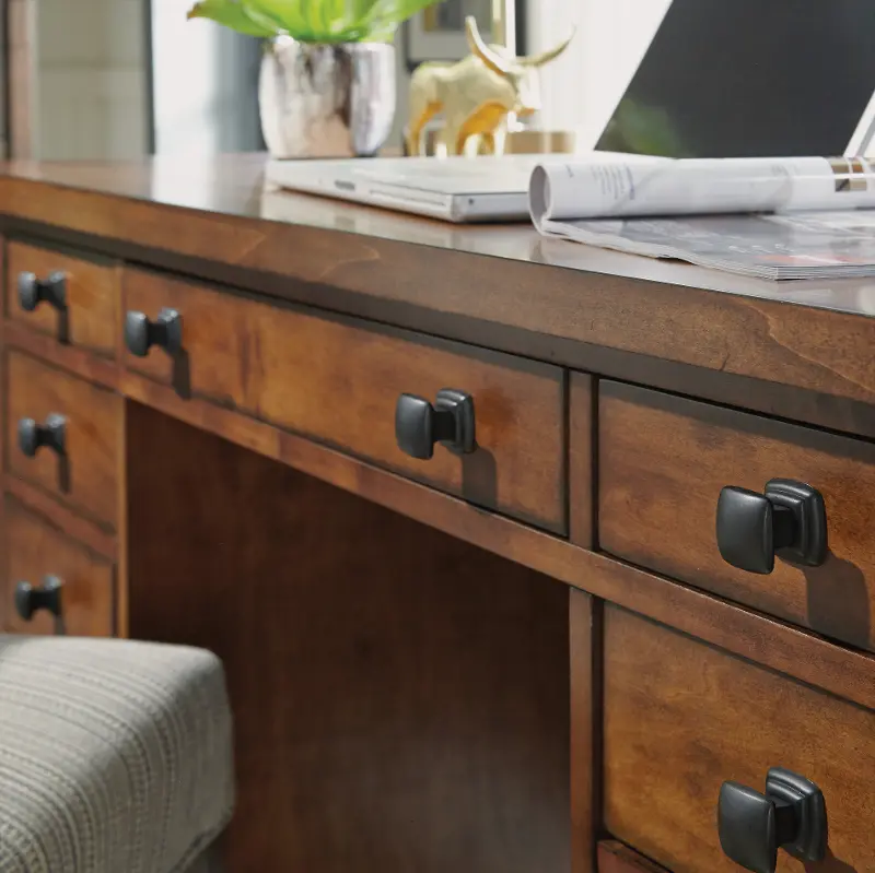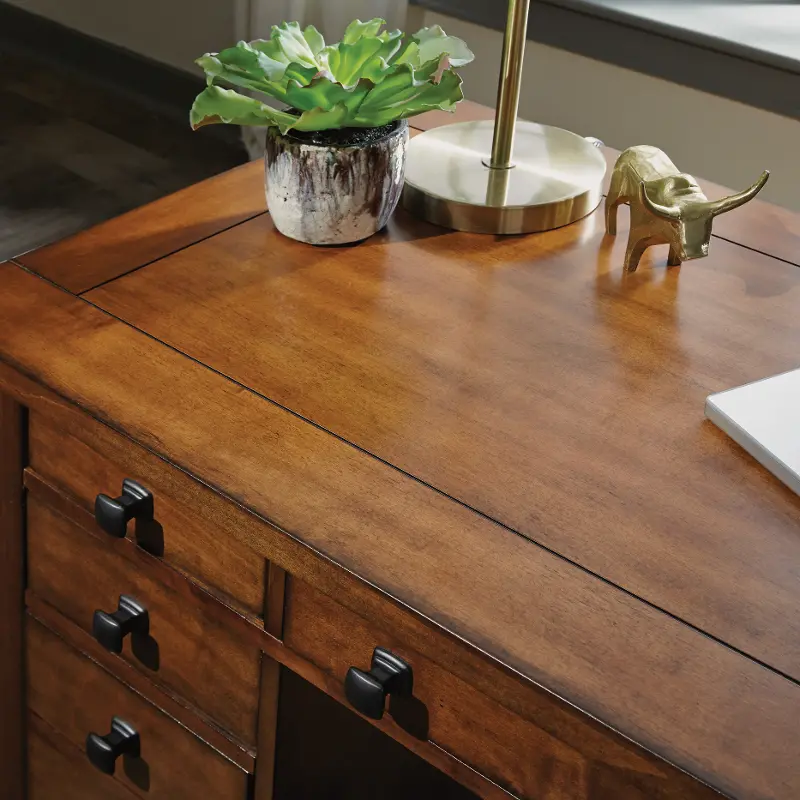 Available at RC Willey, this rustic maple brown executive desk is finished in an aged maple, with burnished edges, and distressing, to provide an aged worn look.
