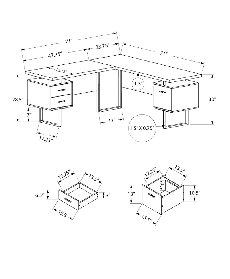 This computer desk can be configured on the left or right hand side making it adaptable to your needs. Ample storage space to store office supplies, papers, and files folders, make it easy to keep your work space tidy. Featuring 2 open concept adjustable shelves, 3 drawers and a cabinet accented by silver colored drawer pulls, this office desk is both stylish and practical. Keep your office workspace clutter and distraction free.