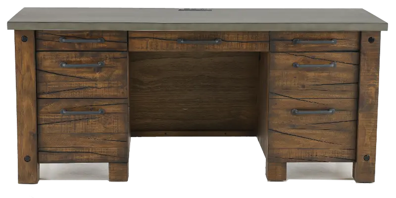 The rough-hewn wood finish highlights intentionally split wood veneers to provide authentic, aged character. While faux concrete tops add to the mix of materials imparting rustic industrial appeal.