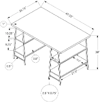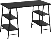- Industrial-style computer desk with 4 fixed, open shelves supported by sawhorse-style legs in a black metal finish