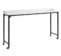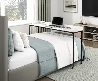 This desk easily slides over the top of your bed, allowing for convenient tabletop access while you unwind. Its white tabletop will effortlessly blend in with a variety of decorating tastes, while black adjustable metal legs with casters make it easy to move around.