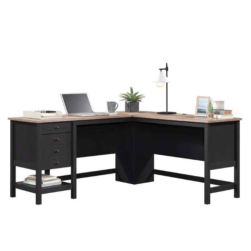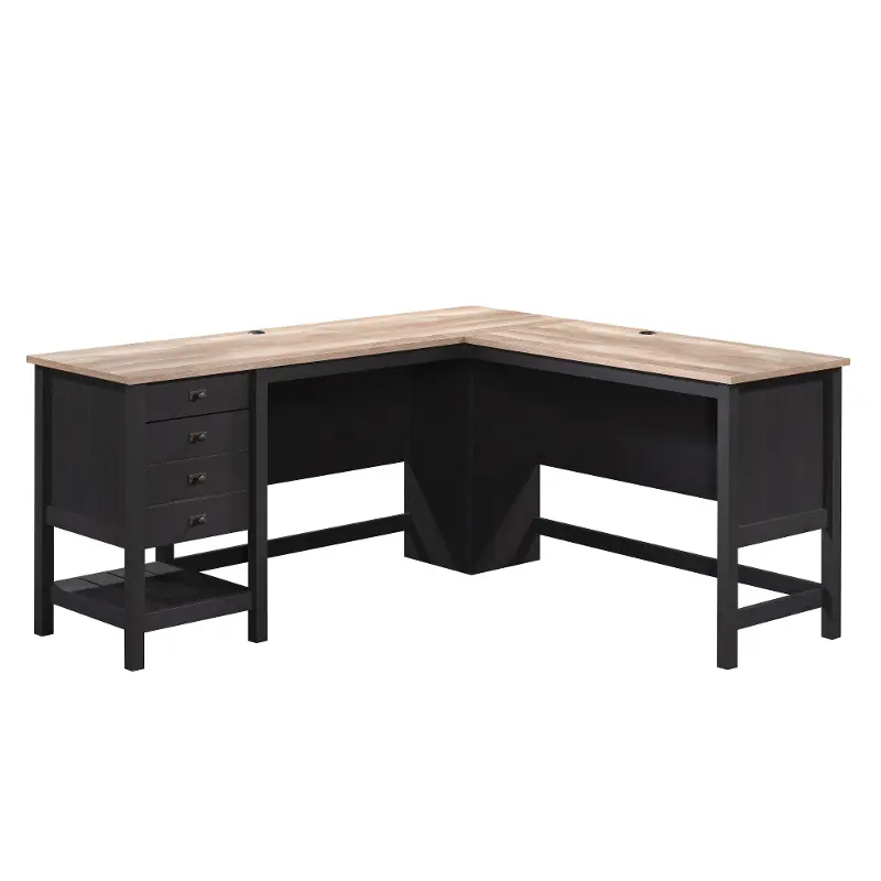 With its L-shaped design, this functional desk offers plenty of room for your computer, lamp, books, and office supplies. Four drawers on one side conveniently allow for organization, and a lower shelf features space to store smaller books or storage bins. The sleek black finish is complimented by the oak-accented top creating a warm and inviting place to work.