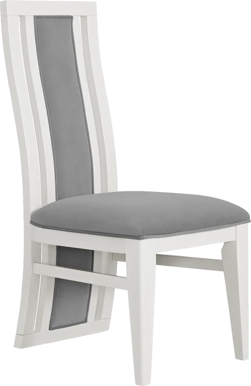 Solidly built, this side chair is finished in a high-sheen white with a gray upholstered seat and backrest. Subtle curves on the elongated backrest further enhance its sleek, eye-catching charm.