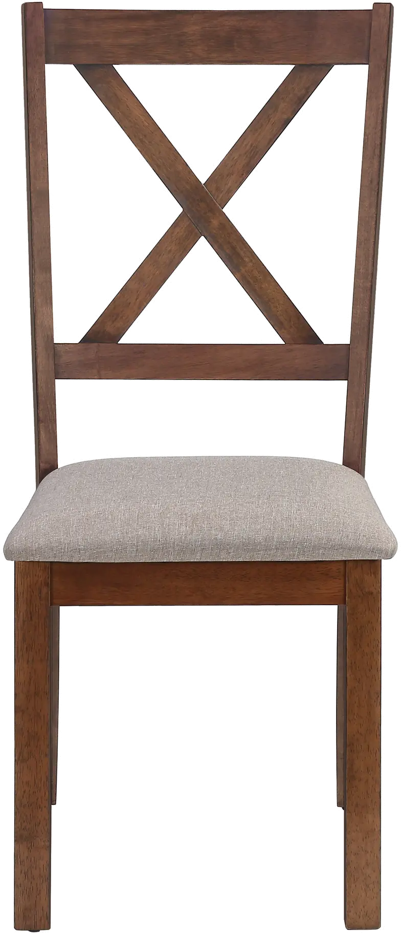This set of 2 side chairs features a transitional style and a warm walnut brown finish. The seats are upholstered in a durable light brown fabric with thick padding for maximum comfort. Its cross-back backrest further enhances its versatile appeal. Made from quality engineered wood, the subtly slanted frame and straight front legs with curved back legs provide reliable stability due to the sturdy construction. The simple design, fashionable style, and neutral finish of these armless chairs are appealing for a range of decors, and suitable to place in any room.