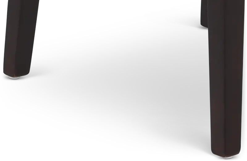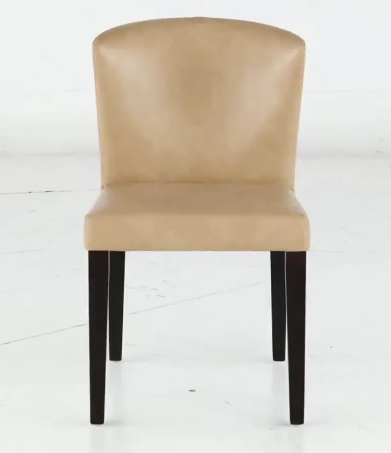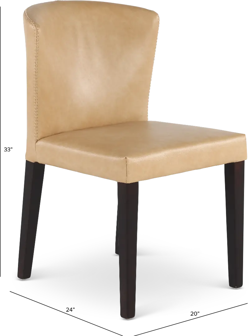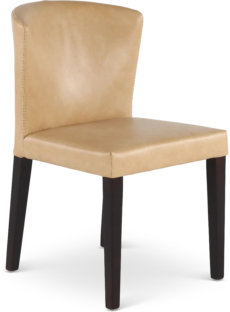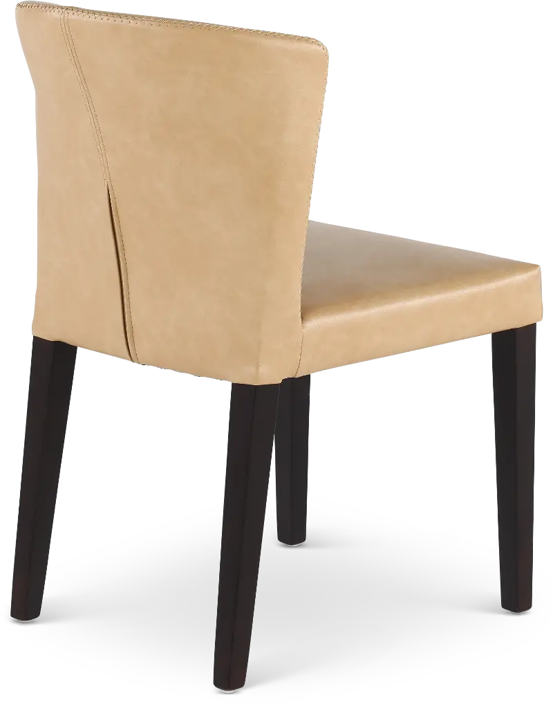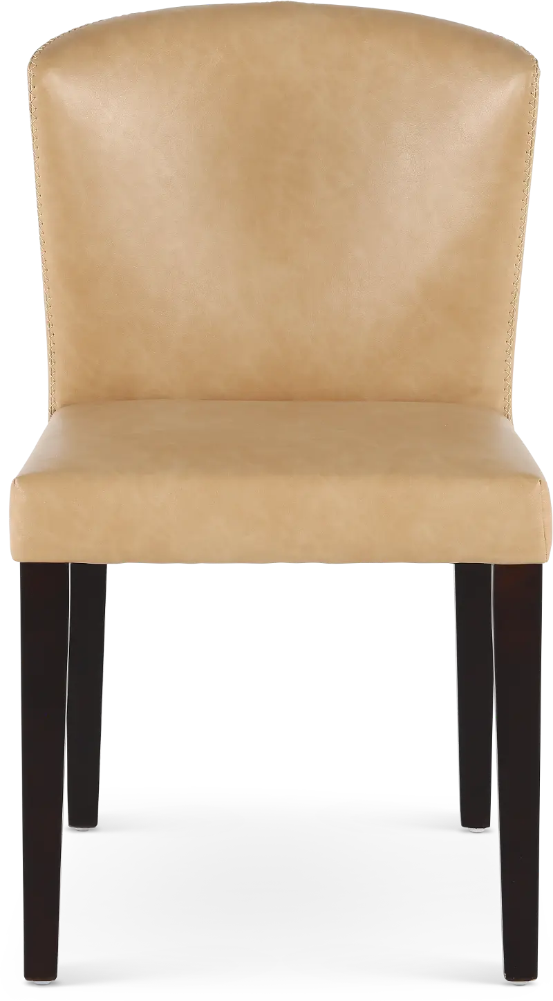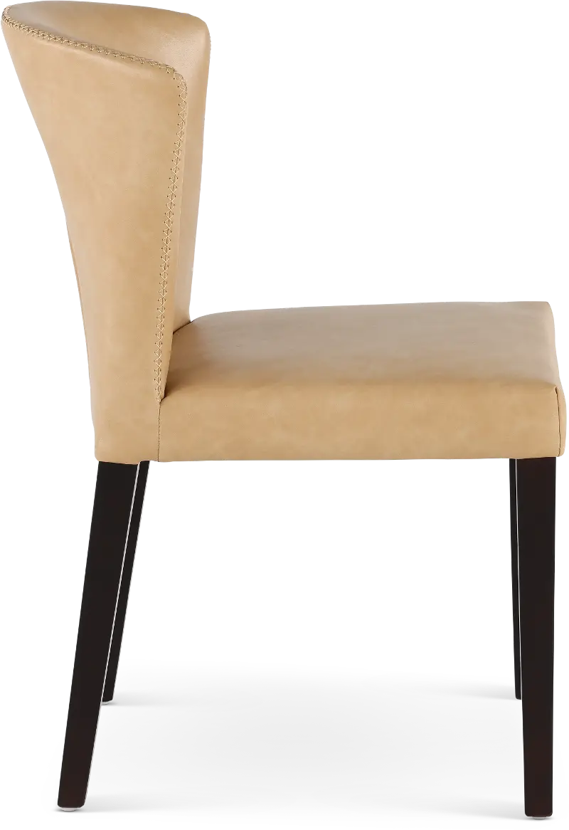 Tailored in a durable tan leather-look fabric, this upholstered dining chair offers an unfussy silhouette with a curved backrest for comfort. Sleek dark-finished legs add warmth, while exposed stitching along the backrest further enhances its eye-catching appeal.