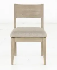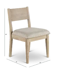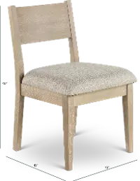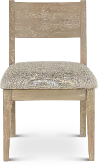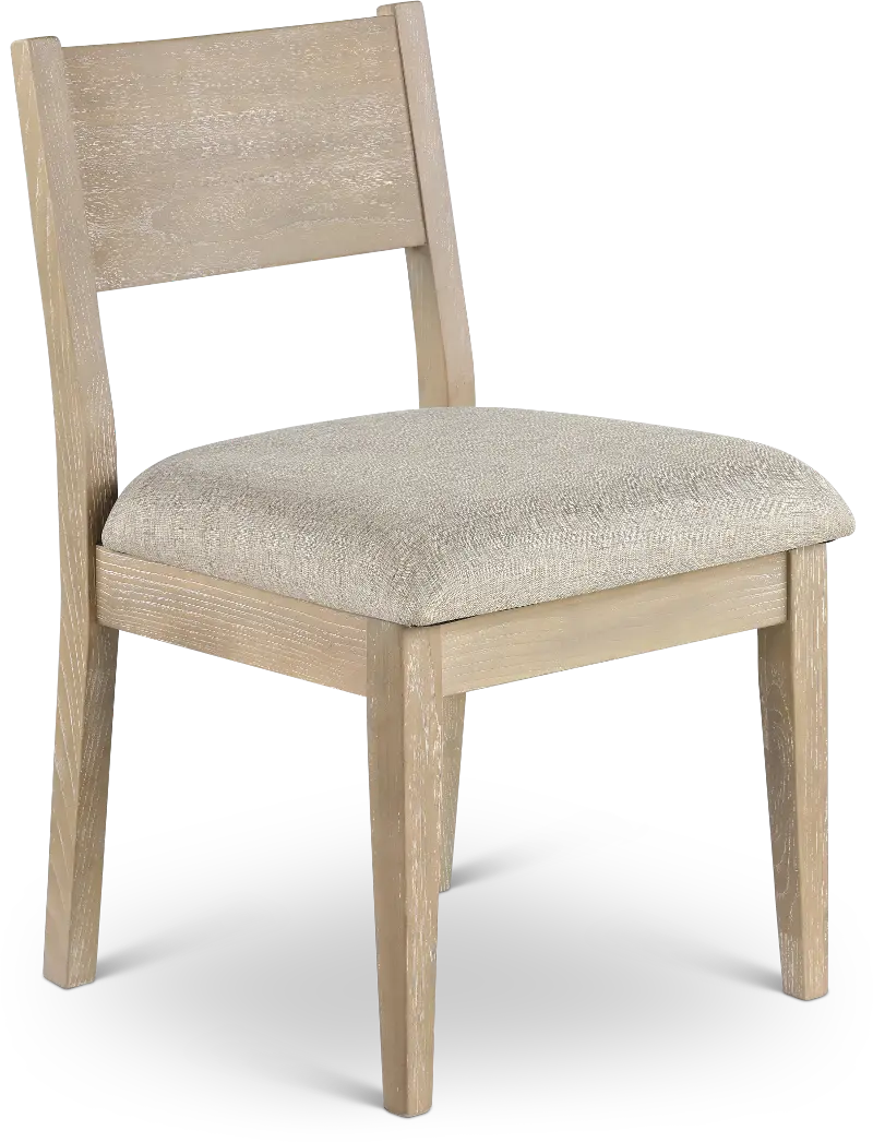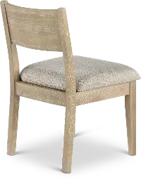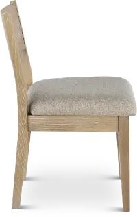 This side chair features a solid wood backrest, an upholstered padded seat, and a wheat-hued finish that showcases the natural beauty of the wood's grain. An effortless silhouette and comfortable design further enhance its inviting appeal.