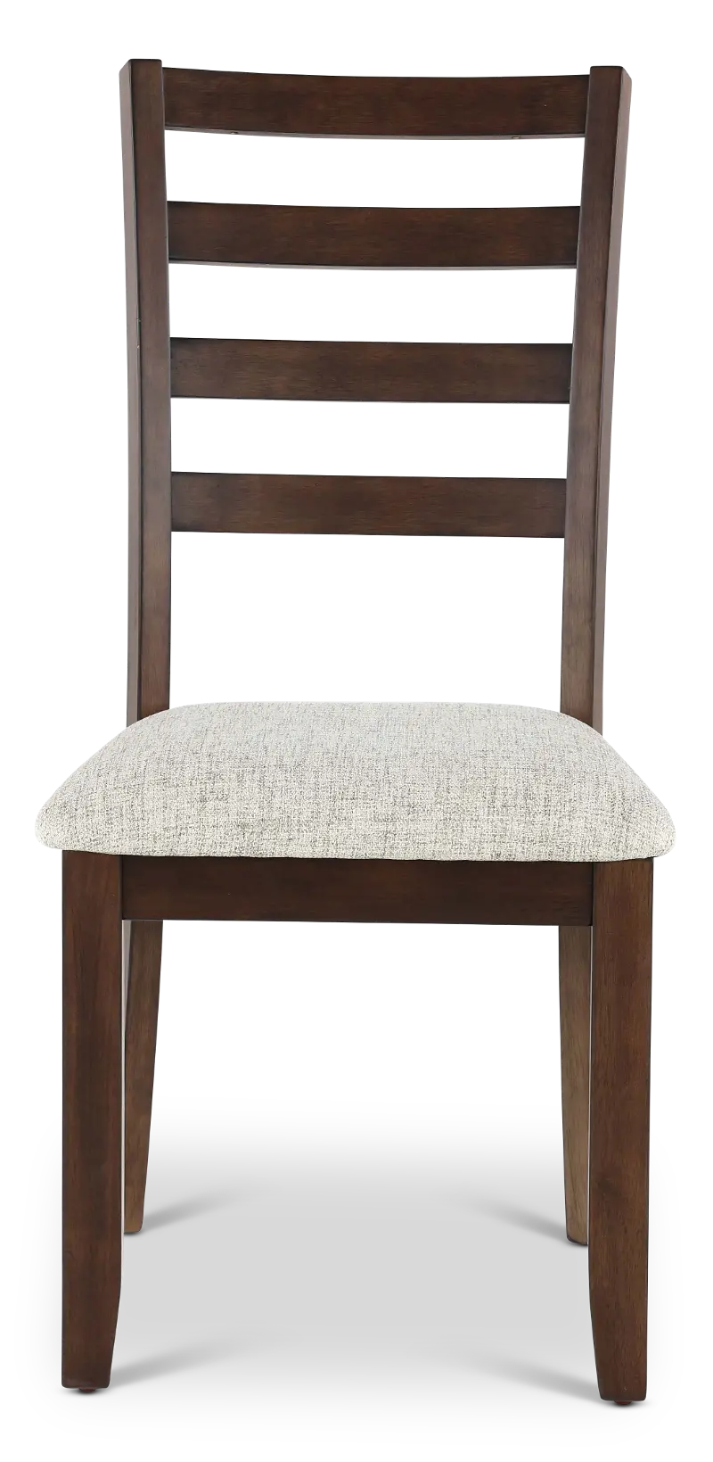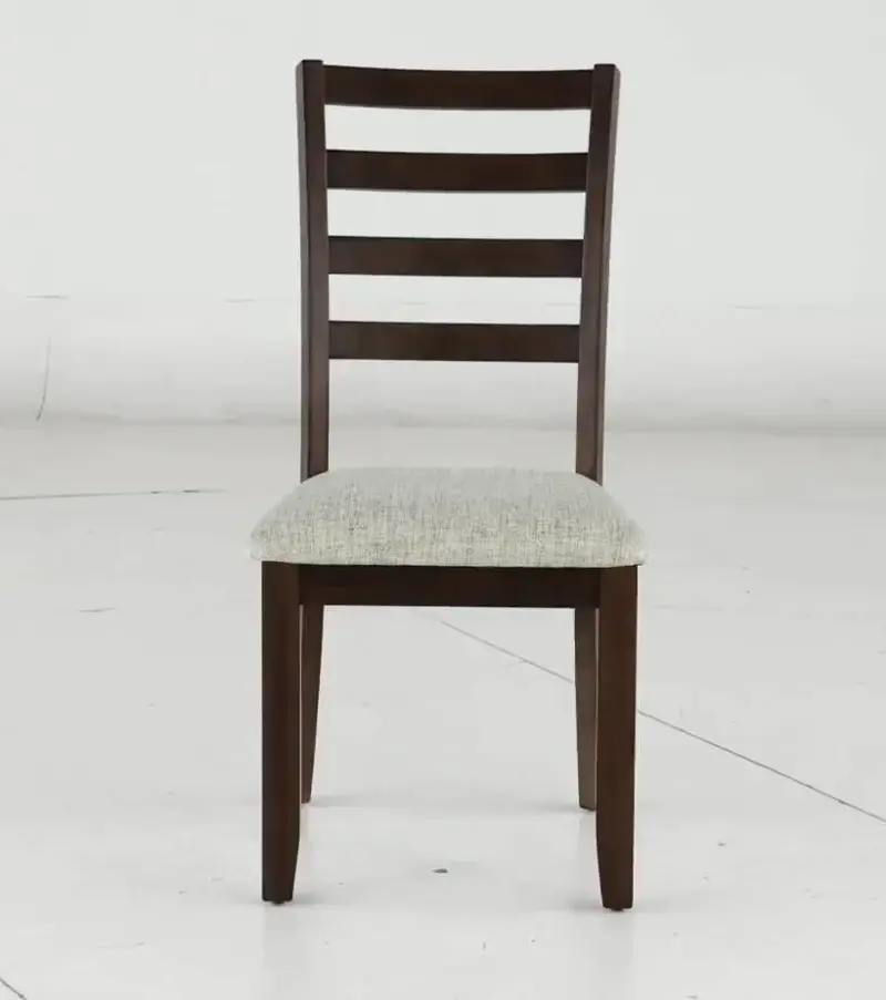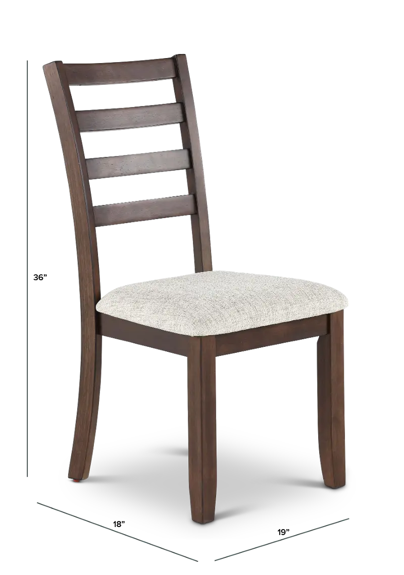 Sturdily crafted, this side chair with a ladder-back design features a deep brown finish beautifully complemented with a light gray-hued upholstered seat. Its clean lines and effortless feel make it a great choice for a range of tastes and spaces.