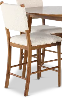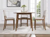This 5-piece counter-height dining set is solidly crafted and features a pecan brown finish that highlights the natural grain and knots of the wood. The table's knife-edge top, tapered legs, and cross-stretcher base enhance its versatile silhouette and mid-century vibe, while the counter-height stools linen-hued padded seats and backrests add comfort and character.