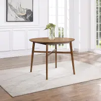Add effortless, unfussy style to your kitchen or dining space with the Oslo collection! This counter-height dining table is solidly crafted and features a pecan brown finish that highlights the natural grain and knots of the wood. The knife-edge top, tapered legs, and cross-stretcher base enhance its versatile silhouette and mid-century vibe. Measuring 46" round, this dining table can comfortably seat 4.