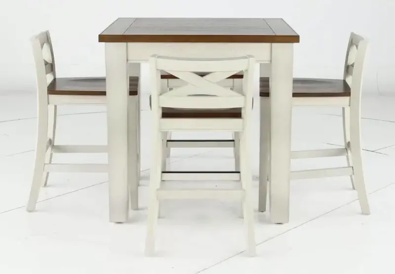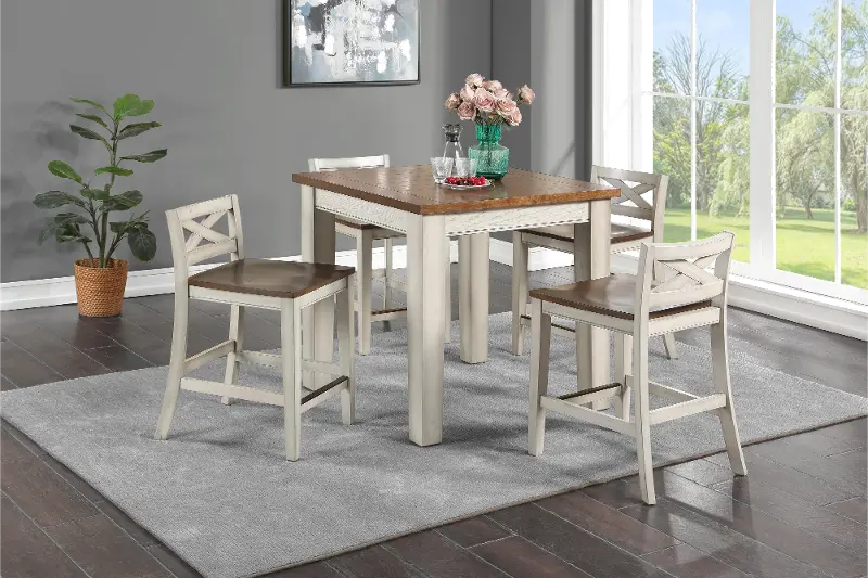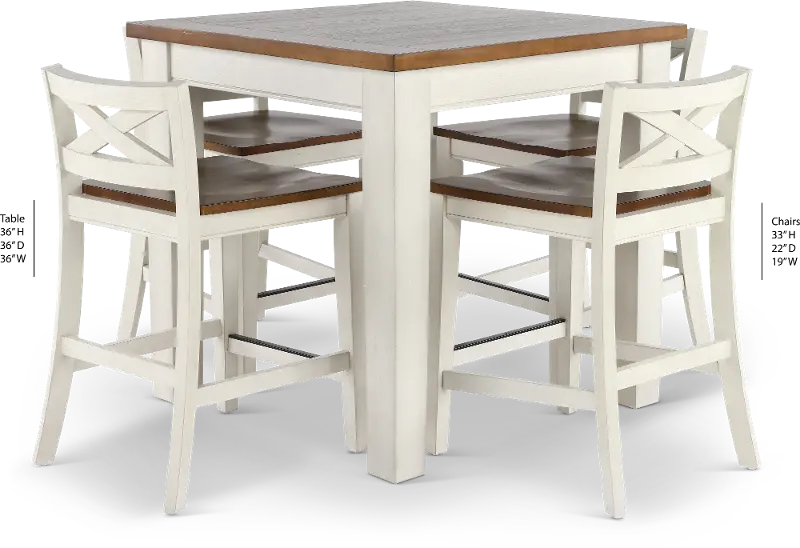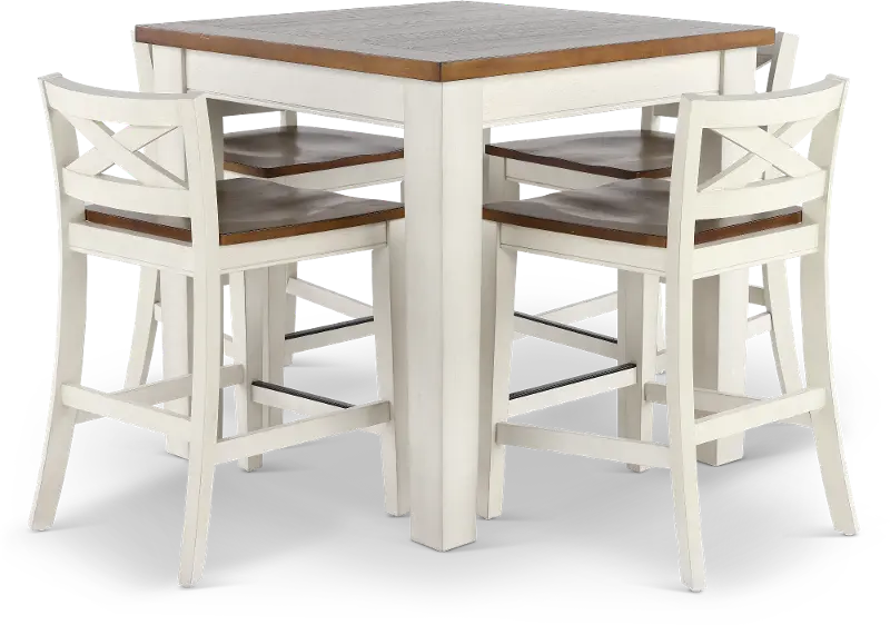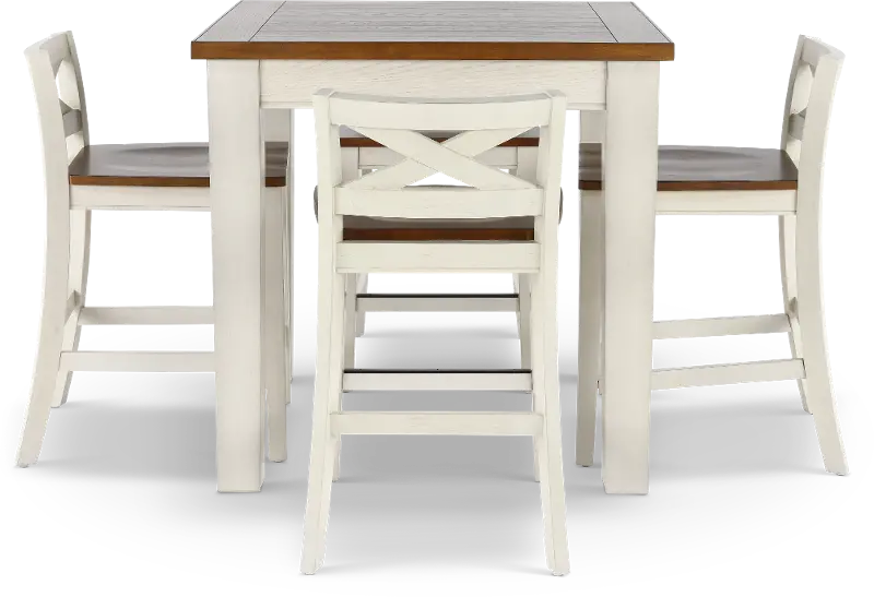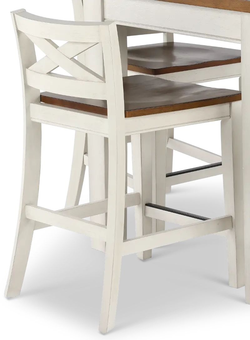 This 5-piece counter-height dining set features a two-tone rustic white and honey oak finish that will add warmth and charm to your kitchen or dining space. The counter stools feature low criss-cross backs, wooden contour seats, and footrests that structural stability, strength, and comfort. The counter-height table features timber beam-inspired table legs with a plank table top.