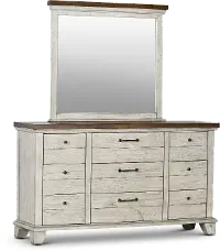 Sturdily crafted, this dresser features a white-smoke finish with a contrasting honey-smoke stained top. Its 9 deep, double-stacked drawers are handsomely enhanced with planked-effect drawer fronts and antique pewter drawer pulls. Side drawer glides provide smooth opening and closing.