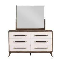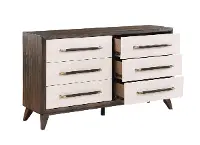 Solidly crafted, this dresser features a walnut brown finish artfully paired with white drawer fronts. Eye-catching drawer pulls and flared legs further enhance its chic, inviting style. The 6 drawers offer stained interiors and open and close smoothly with ball-bearing side guides.